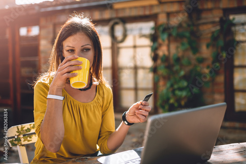 Women Drinking Coffee At Backyard Patio And Using Credit