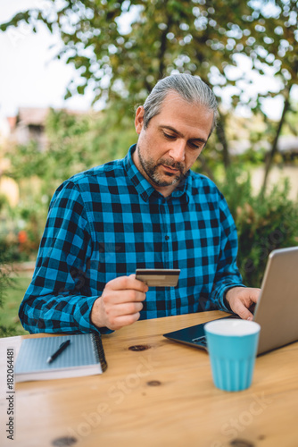 Men Using Credit Card At Backyard Patio Stock Photo